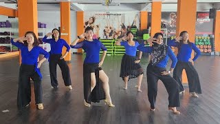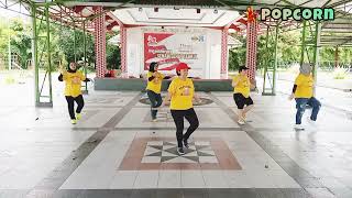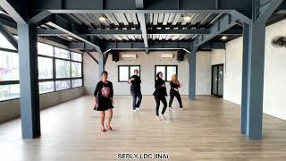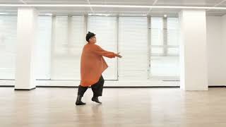 [1 – 9] Hip bumps, back R pop L knee, step lock step, rock R fwd, behind, 3/8 L, ¼ L side R