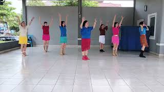 6 - 7 - 8Straighten in L knee sliding R hand up R leg (6), step R fwd flicking L foot back and click both hands/fingers up and above shoulder height (7), rock L fwd dropping hands (8) 12:00
