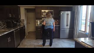 5-6-7-8Step LF to left, Step RF behind left, Step LF 1/4 , Scuff RF forward (9:00)