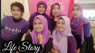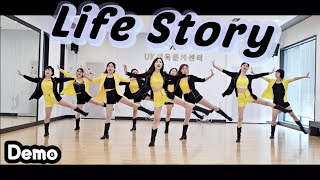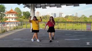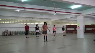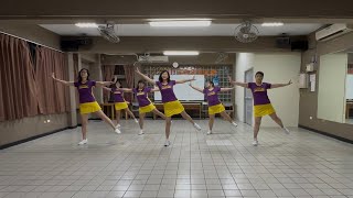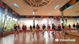 1-2RF step forward to the R diagonal with a back flick with the L leg (arms: raise your right hand), LF step next to RF and go down bending little both knees