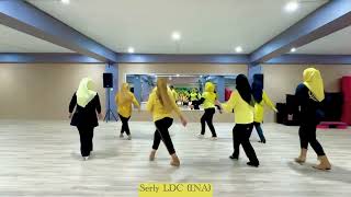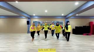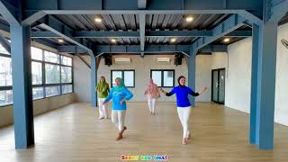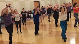 &7-8Step left back, touch right forward, lift right hand to head height twist right wrist in