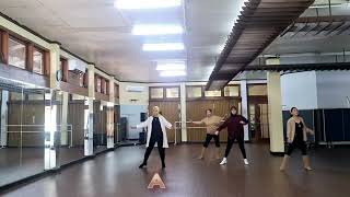 Hinge/Lift 5/8, Run Forward x2, Rock Forward, Recover, 1/4 Sways x2, Run Around 1+1/8 w/ Sweep