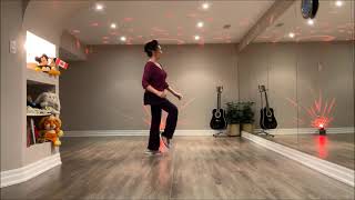 7 8Tap R heel forward (7), hook R heel across L shin (8)