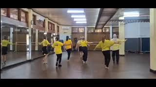 7-8Step LF together bending both knees and lowering R arm (over 2 counts)