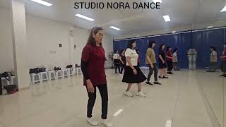 1234.Cross RF over LF, ¼ Turn R. Step LF back, Step RF to the right, Step LF forward