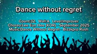 Dance Without Regret er en 32/4 improver linedance, moderne, flydende og fyldt med let energi. Trinene er tilgængelige for dansere, der har taget det første skridt videre fra begynder-niveau, men samtidig er der små nuancer i flow og musikalitet, der giver plads til fortolkning og gør dansen interessant på sociale gulve.