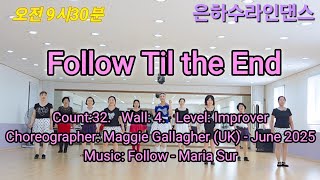 Follow Til The End er en 32/4 improver linedance, smuk, blød og med et flow, der følger musikken tæt. Trinene er velafbalancerede og tilgængelige for improvere, men de kræver stadig musikalitet og indlevelse, hvilket gør dansen til en følelsesladet oplevelse på gulvet.