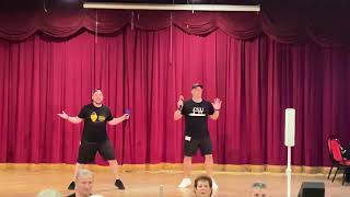 7 – 8Step L to L side (7), touch R next to L (8) … Arms: push both arms to sides making stop signs ‘Stop’ (7), bring both arms in pointing with thumbs at yourself ‘This’