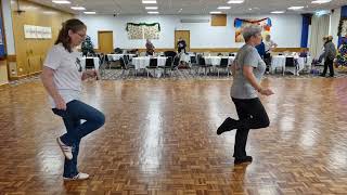 1-2Step forward on ball of R to L diagonal, drop R heel (1:30)