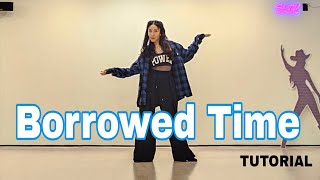 Look down and don’t move as the music is silent (1), Extend R arm out, Extend L arm out as he says “On Bo-“ (approximately &2), Raise slowly both arms up as he says “- rrowed” (approximately 3),as he says “Time”, as you are raising both arms up, point with your R index your L wrist above your head (approximately 4-5-6-7-8), when you start the dance again, open both arms to sides on count 1
