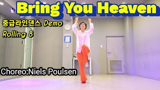 Bring You Heaven er en intens og følelsesladet 48/3 high intermediate phrased – rolling 8-dans, hvor musikaliteten styrer trinene hele vejen. Dansen bevæger sig mellem store flow-bølger, fine detaljer og dybe vægtskift, som rolling 8-stilen kalder på. Helheden føles som en koreograferet fortælling, der følger musikkens dynamik fra stille øjeblikke til kraftfulde udbrud.