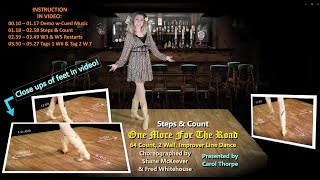 One More For The Road er en flydende og energisk 64/2 improver-dans med et tydeligt irsk præg og et naturligt, rullende flow. Trinene har en fremadrettet bevægelse og en rytmisk puls, der gør dansen oplagt til både traditionel line dance og contra-opstillinger. Den lange struktur giver plads til musikalitet og gentagelser, som føles tilfredsstillende snarere end tunge.