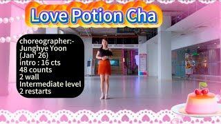 Love Potion Cha er en 48/2 intermediate-dans med tydelig cha cha-karakter og et roligt, kontrolleret tempo. Trinene er flydende og musikalsk placeret med fokus på vægtskift, hoftearbejde og timing. Det lave tempo stiller krav til kontrol og balance, og dansen belønner præcision frem for kraft.