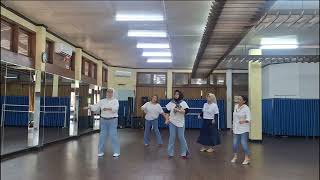 1-2&3RF cross over LF & sweep LF fwd, LF step forward, RF tap behind LF, RF step back & sweep LF back