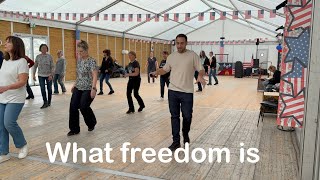 What Freedom Is er en dynamisk og velafbalanceret 32/2 intermediate-dans med tydelig fremdrift og klar rytmisk struktur. Trinene er kompakte og præcist placeret i musikken med fokus på markering, retningsskift og kontrollerede overgange. Tempoet er moderat, men energien er tydelig, og dansen kræver sikker timing og kropskontrol. Udtrykket er direkte og jordnært med plads til både power og musikalitet.