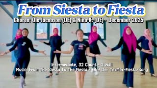 From Siesta to Fiesta er en kompakt intermediate-dans med 32 counts på to vægge og et tydeligt latin-inspireret udtryk. Den har en livlig og festlig energi, hvor rytmen er i centrum.