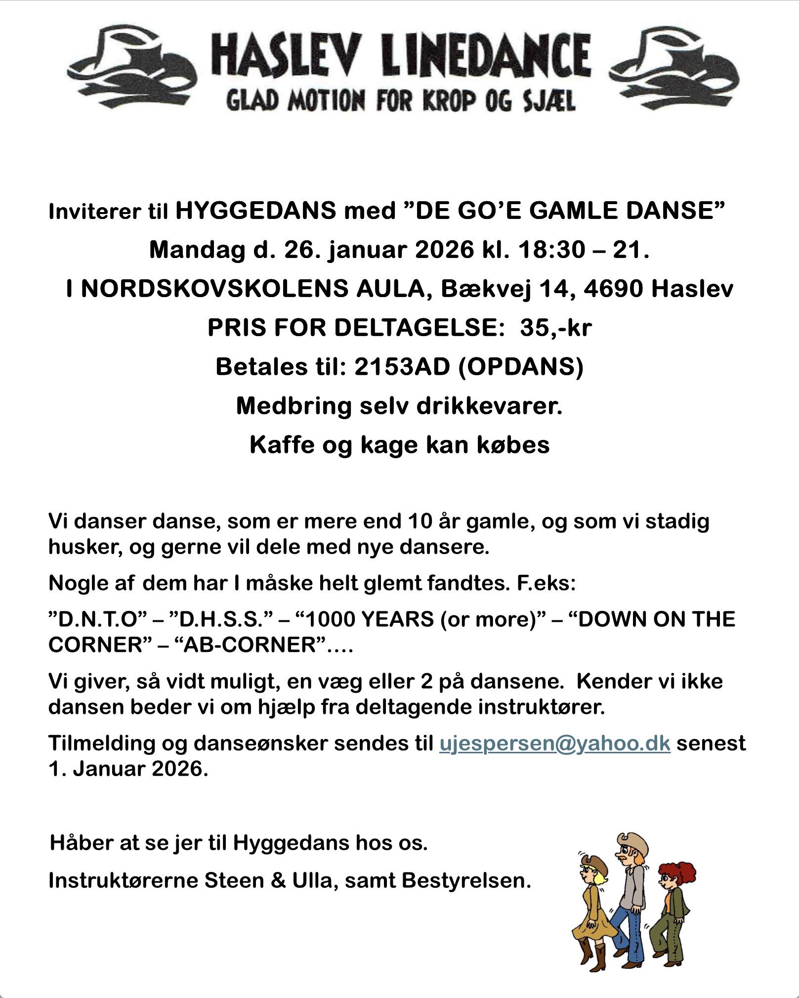 🕺 HASLEV LINEDANCE Glad motion for krop og sjæl 📍 Nordskovskolens Aula 💰 Pris 35 kr. pr. deltager Betale... Læs mere
