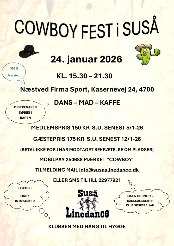 Suså Linedance har eksisteret siden juni 2005, og har hjemmehørende i Næstved Kommune. Linedance er foreningens samlings aktivitet, sammen med socialt samvær. Vi er en COUNTRY KLUB, danser primært til country musik – ny såvel som gammel. Der bliver dog også introduceret andre musikgenrer bl.a. i forbindelse med ud læring af års danse samt populære danse. For mere info: Klubbens hjemmeside suaaalinedance.dk Vores Facebook side: Susålinedance. Eller du kan kontakte os på mail adressen:ala7@mail.dk