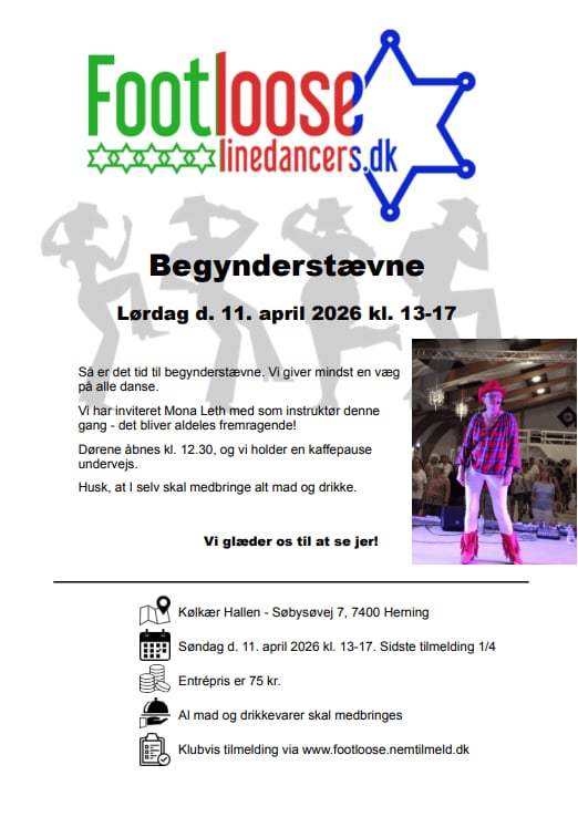 Så er det tid til begynderstævne. Vi giver mindst en væg på alle danse Dørene åbnes kl. 12.30 og vi holder en kaff... Læs mere