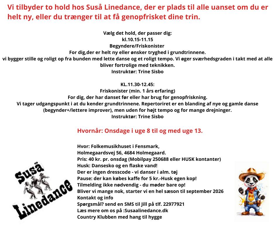 Suså Linedance 💃 - Onsdage i uge 8 til og med uge 13 |