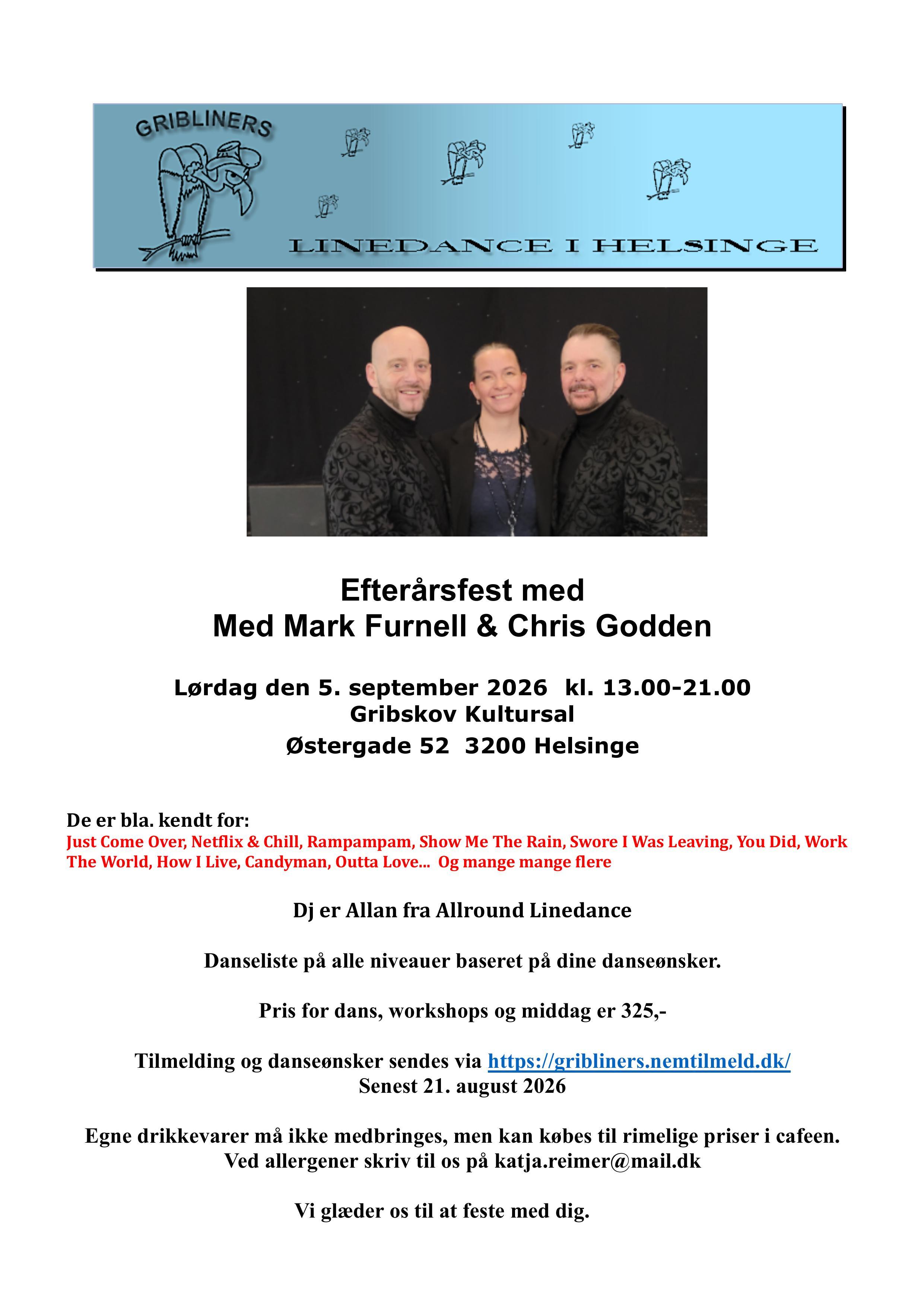 📩 Tilmelding og danseønsker: Via https://gribliners.nemtilmeld.dk/ Senest 21. august 2026